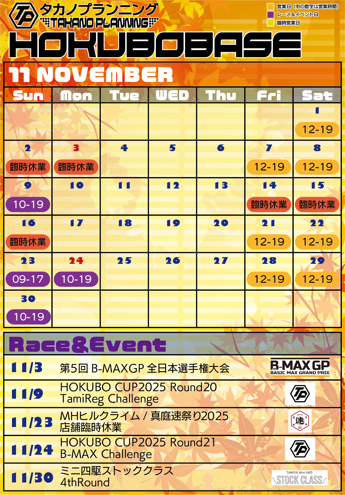 - 2023年10月26日 11月26日HOKUBO CUP2023 Round11 B-MAX Challengeのご案内ページを公開しました。(11/10レイアウト公開)